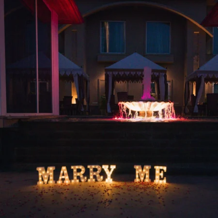 Turn your proposal into an unforgettable memory with our Indoor Romantic Proposal Date package. Enjoy a private sitting arrangement, candlelit table décor, fairy lights, and the iconic “MARRY ME” LED prop to set the perfect stage. A 3-course gourmet meal with welcome drinks, served by a private butler, adds elegance to your evening. With roses, lights, and romantic music, this setup ensures the most magical proposal experience. 💍✨