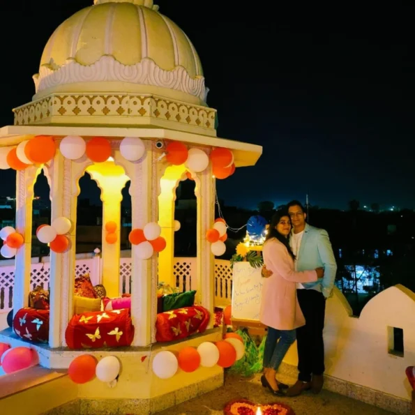 Experience a magical evening with our Swing Cabana Candlelight at Radisson. Enjoy a private poolside cabana adorned with fairy lights, rose petals, and glowing candles. Relish a 5-course meal served by a private butler in a romantic ambiance surrounded by floating heart-shaped balloons. A perfect setting for an unforgettable celebration of love.