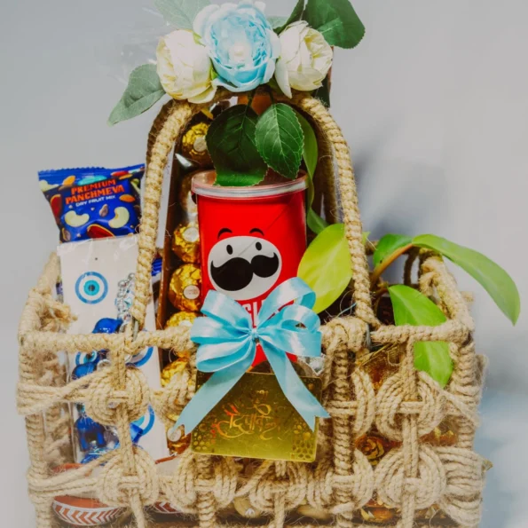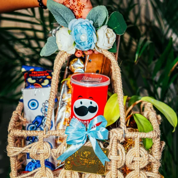 Packed in a beautiful trunk box, it includes stylish earrings, a statement neckpiece, scrunchies, Ferrero Rochers, a Rakhi card, and quirky photo props.