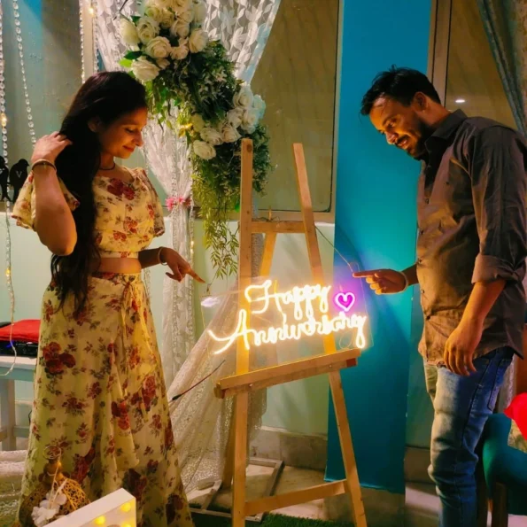 A perfectly curated celebration setup with glowing neon accents, great music, and delicious food—designed to make your special moments truly unforgettable.