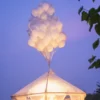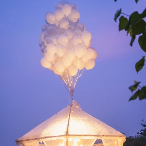 Upon arrival, walk down a beautifully laid white fur pathway adorned with pompas, lanterns, and cages, leading you to a gorgeously decorated gazebo. The gazebo itself is wrapped in 100–150 pastel and metallic balloons, creating a vibrant and festive atmosphere while remaining elegant. Fairy lights twinkle above, complemented by LED candles placed thoughtfully around the setup to create a cozy and intimate ambiance.