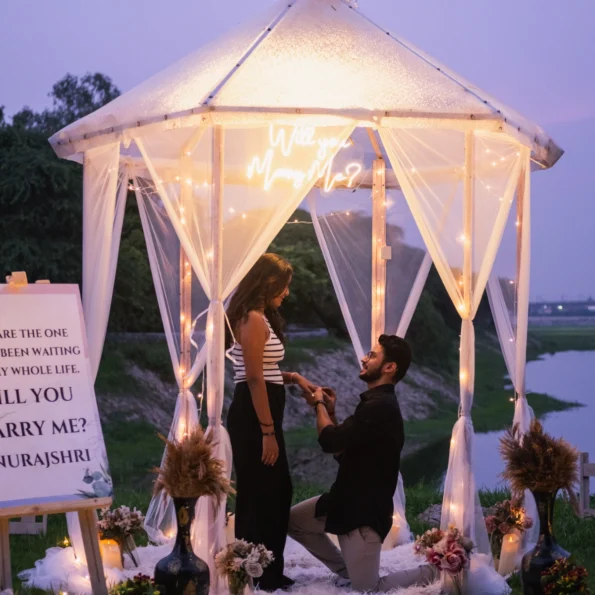 A: Absolutely! This setup is perfect for romantic proposals. You can coordinate with our team for special add-ons like “Marry Me” signage or proposal planning.