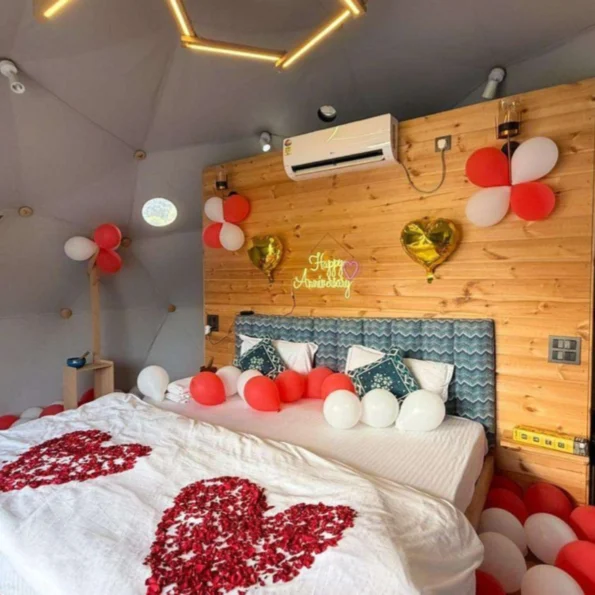 Make your stay even more special with a charming indoor room decoration setup, customized as per your occasion. Featuring elegant balloon combinations and simple yet aesthetic décor, the room is prepared to create a celebratory vibe the moment you walk in. Paired with BBQ, dinner, breakfast, and fun activities like boating, this experience is perfect for birthdays, anniversaries, or romantic surprises.