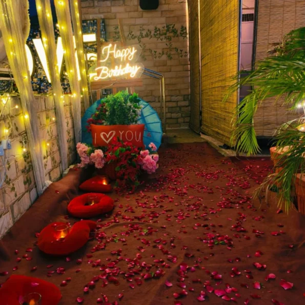 Experience an enchanting evening with our Private Garden Dining in Noida, offering a beautifully decorated table setup with flowers and candles in a serene outdoor ambiance. Enjoy a refreshing welcome drink on arrival, followed by a delicious 3-course meal (with your choice of veg or non-veg dishes) served with personalized butler service. Perfect for a romantic date or a special celebration.
