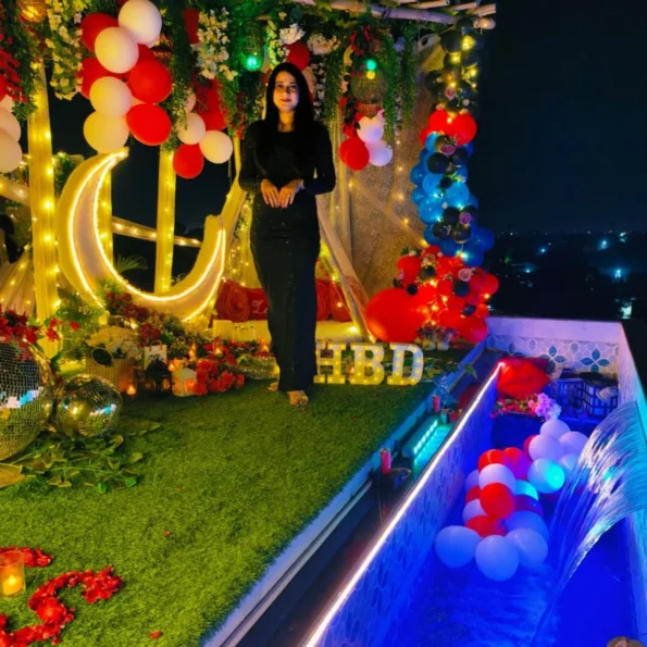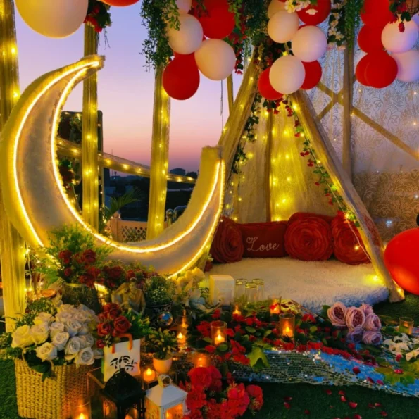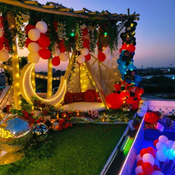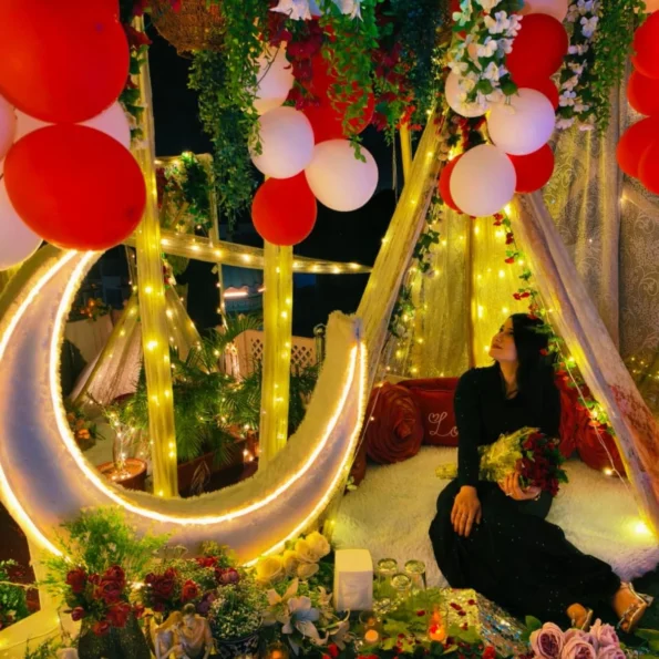 Celebrate in style with a beautifully arranged setup featuring a luxurious red carpet, neon décor, giant moon, and balloons. Perfect for birthdays or special occasions, this experience is designed to create memorable moments.