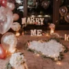 A dreamy and elegant proposal setup designed with soft rose-gold tones, glowing candles, and romantic florals. Perfect to create a magical “Marry Me” moment filled with love and charm.