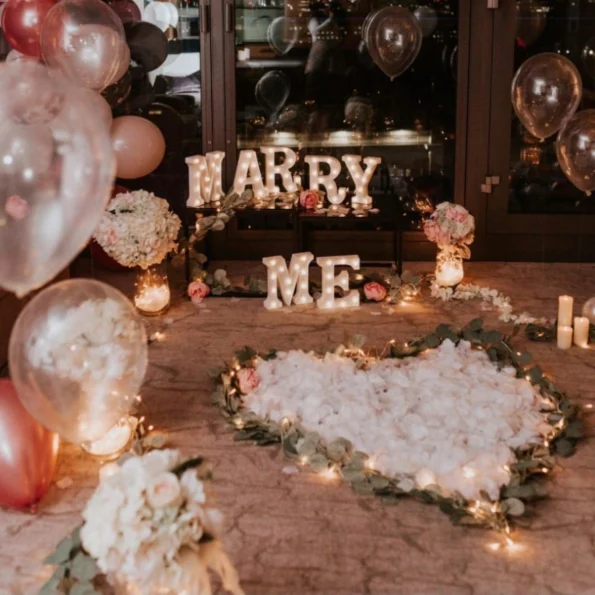 - “MARRY” LED letters placed on the table