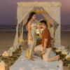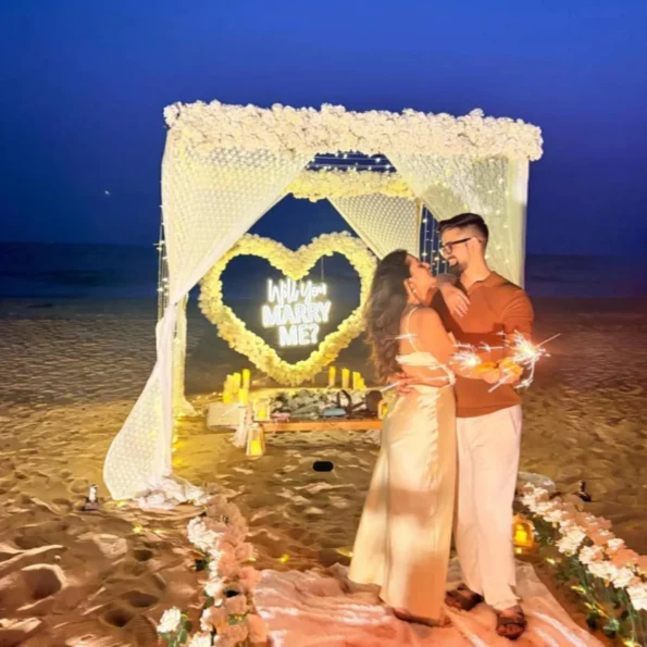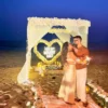 Create the perfect moment to pop the question with a magical beachside proposal setup, featuring a stunning square backdrop with pastel floral décor, romantic lighting, a candlelit pathway, and a private dining experience for two.