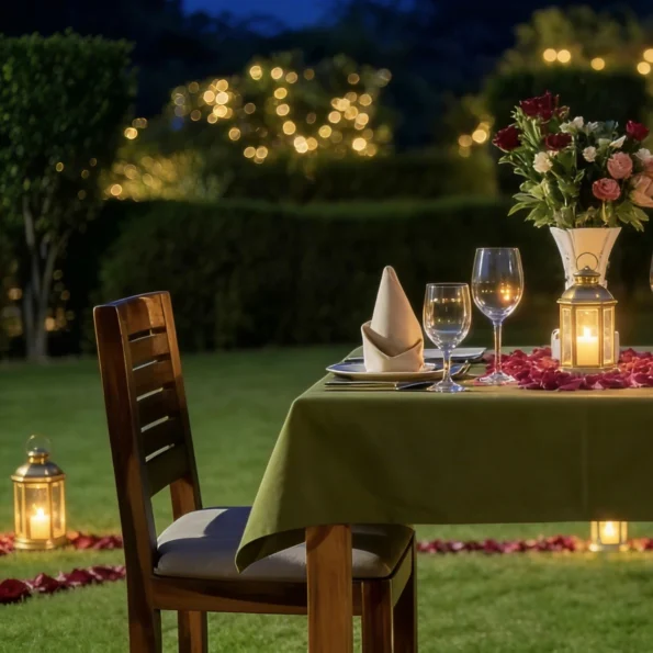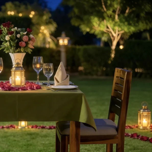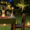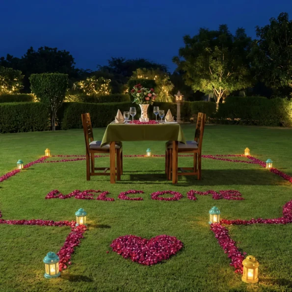 Ans: Yes, the dining table is arranged in a dedicated open-air space to provide an intimate and romantic experience for the couple.