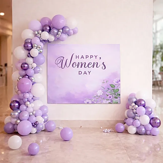 The traditional Women's Day colours are purple (representing justice and dignity), green (representing hope), and white. In 2026, we're also seeing a strong trend toward rose gold, dusty pink, and ivory — which create a warmer, more intimate celebration aesthetic for both homes and offices. We work with any palette you prefer!